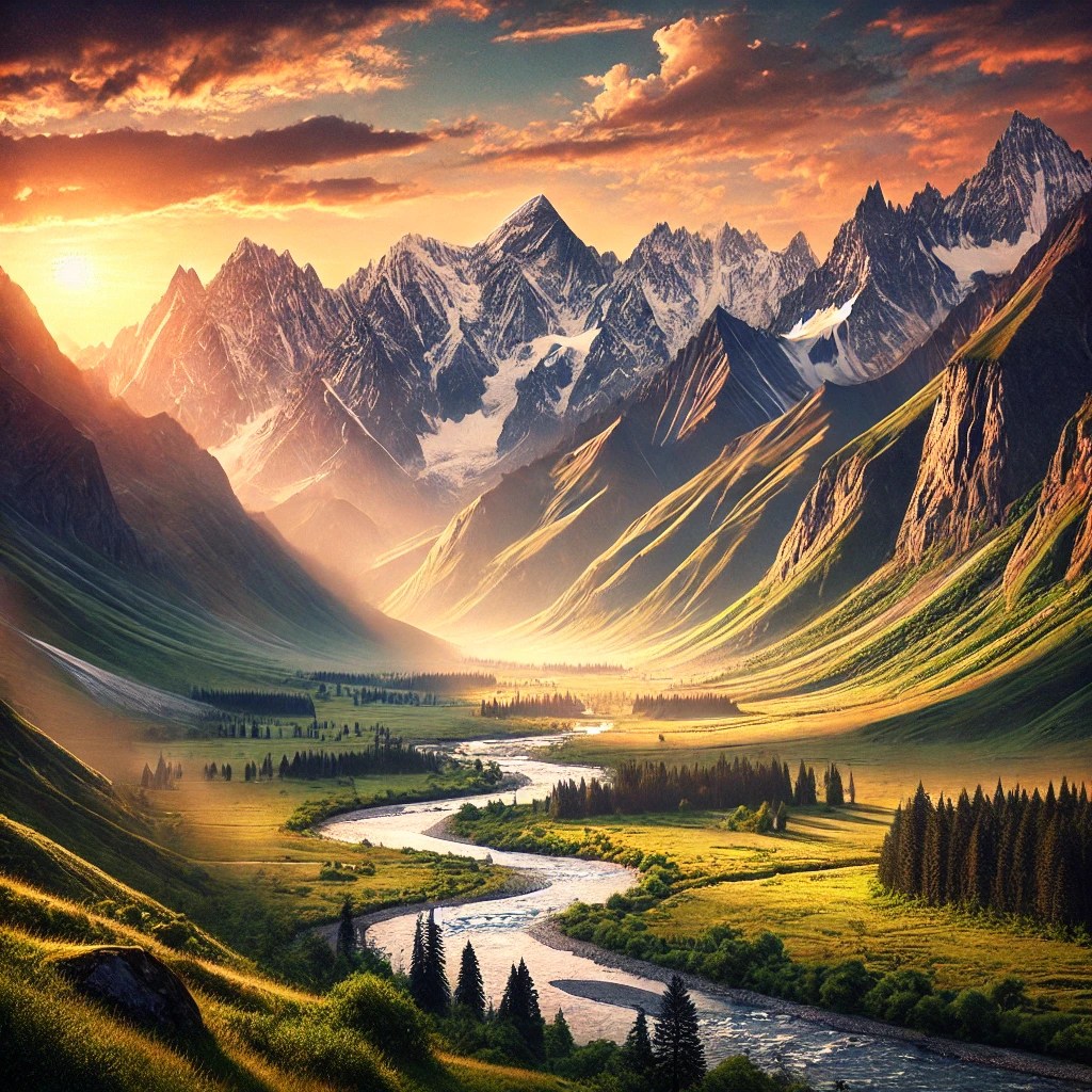 A serene river winds through the valley, reflecting the warm hues of the sunset.