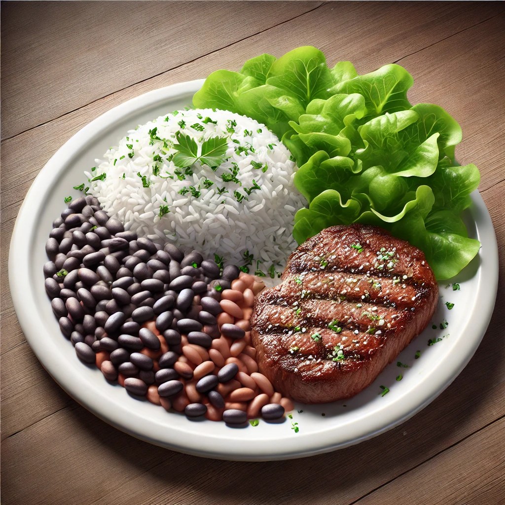 “The image shows a plate of food with a well-balanced meal. It includes a grilled steak with a slightly charred surface, a portion of white rice garnished with chopped herbs, black and pinto beans, fresh green lettuce, and some additional seasonings sprinkled over the dish. The plate is placed on a wooden surface, giving a rustic and appetizing presentation.”