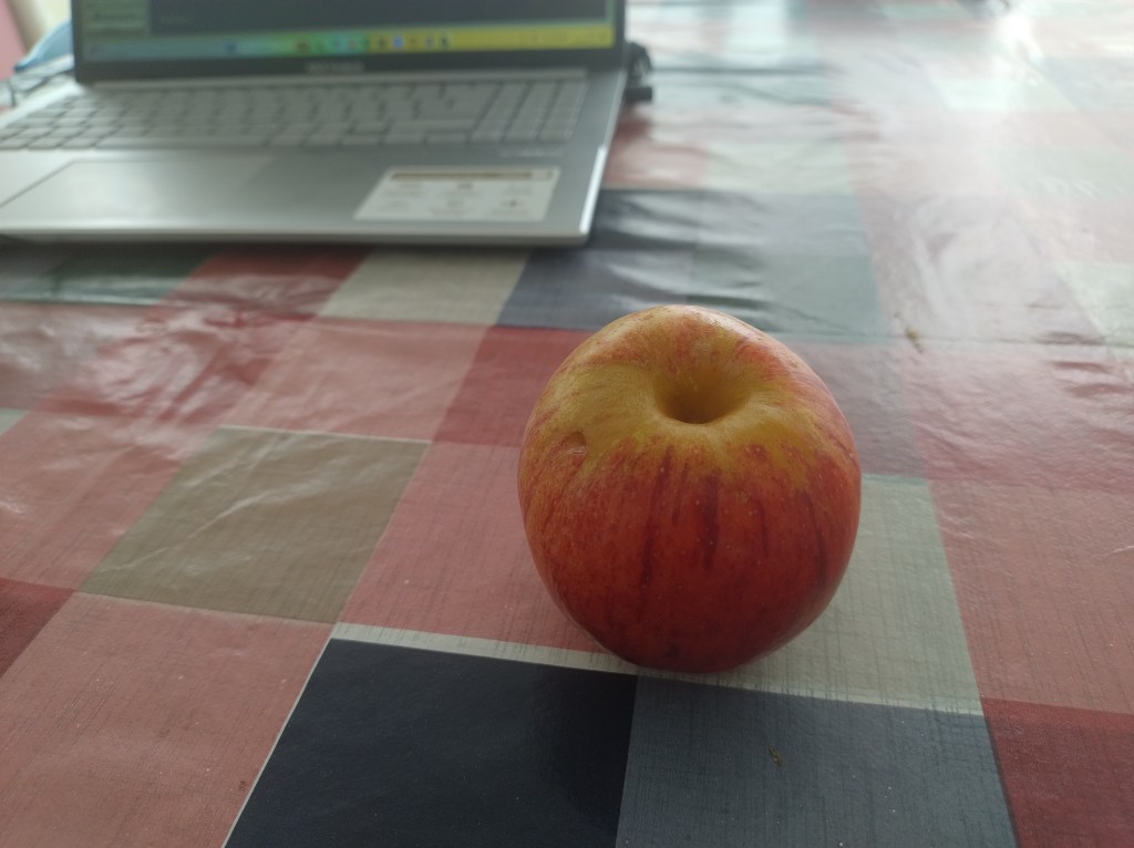 📌 Tradução: Na imagem, há uma maçã vermelha e amarela colocada sobre uma toalha de mesa xadrez.